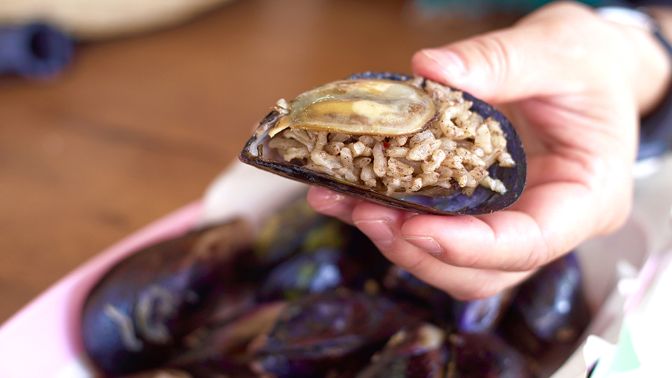 スパイスと一緒に炊き込んだご飯をムール貝に詰めて蒸したものです。